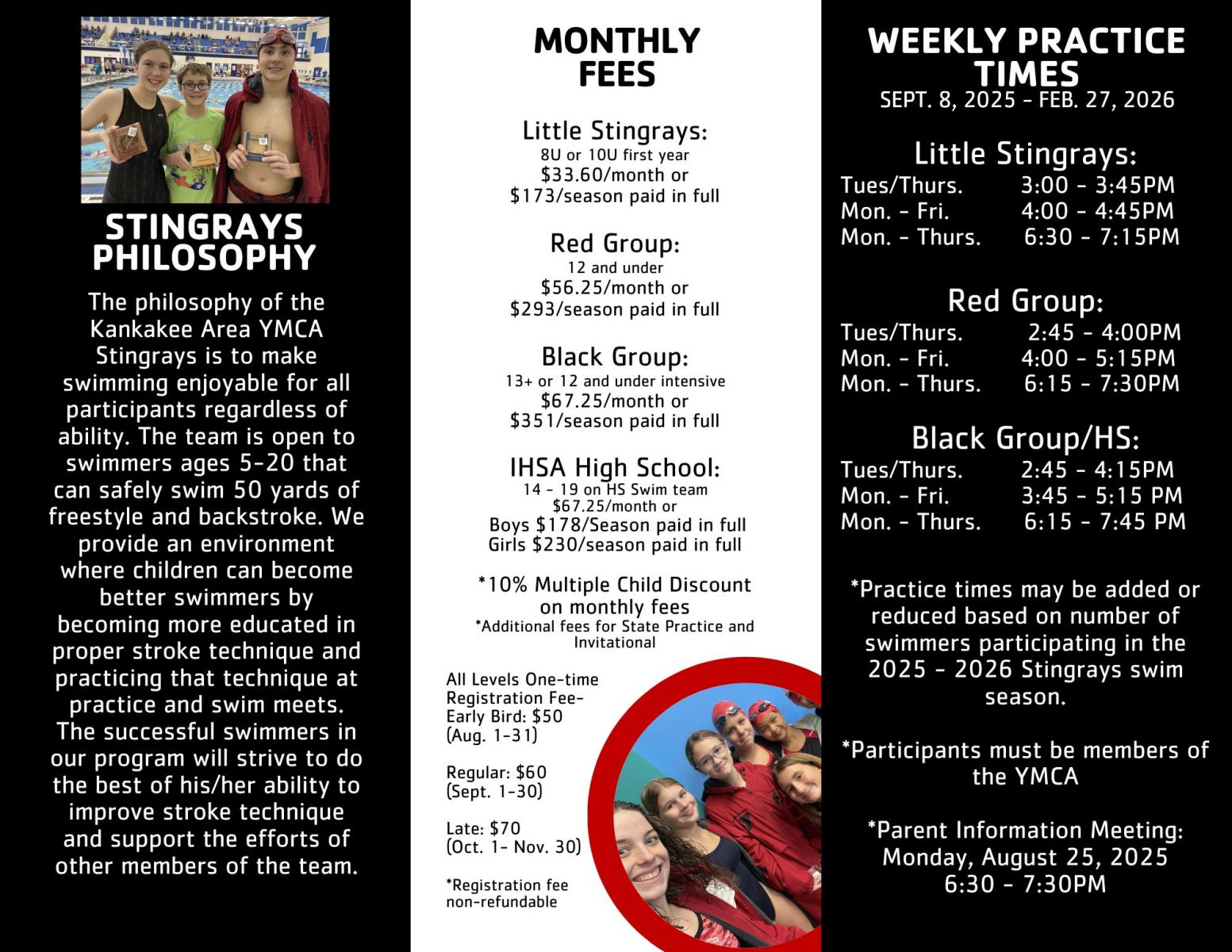 Our team is a YMCA competitive swim team offering high quality coaching and technique instruction for all ages and abilities. The philosophy of the Kankakee Area YMCA Stingrays is to make swimming enjoyable for all participants regardless of ability. To meet that end, we will provide an environment where our children have the opportunity to become better swimmers by becoming more educated in proper stroke technique and practicing that technique during practice and at swim meets. The successful swimmer in our program will be the swimmer who strives to the best of his or her ability to improve his or her stroke technique and supports the efforts of other members of the team. Our athletes, coaches, parents and board members support this philosophy.