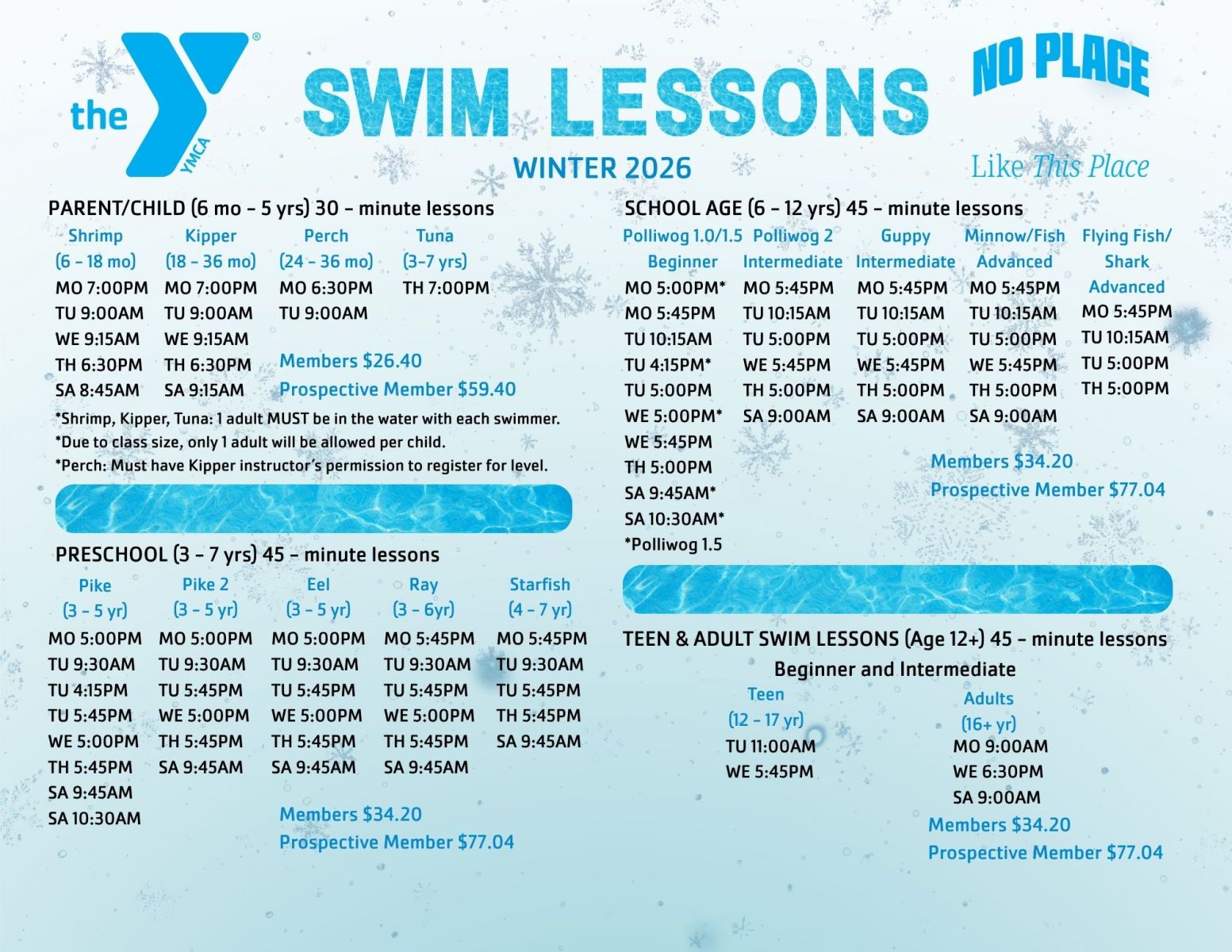 Little to no water experience necessary. Basic water skills are taught including gliding with face in water, floating and kicking |